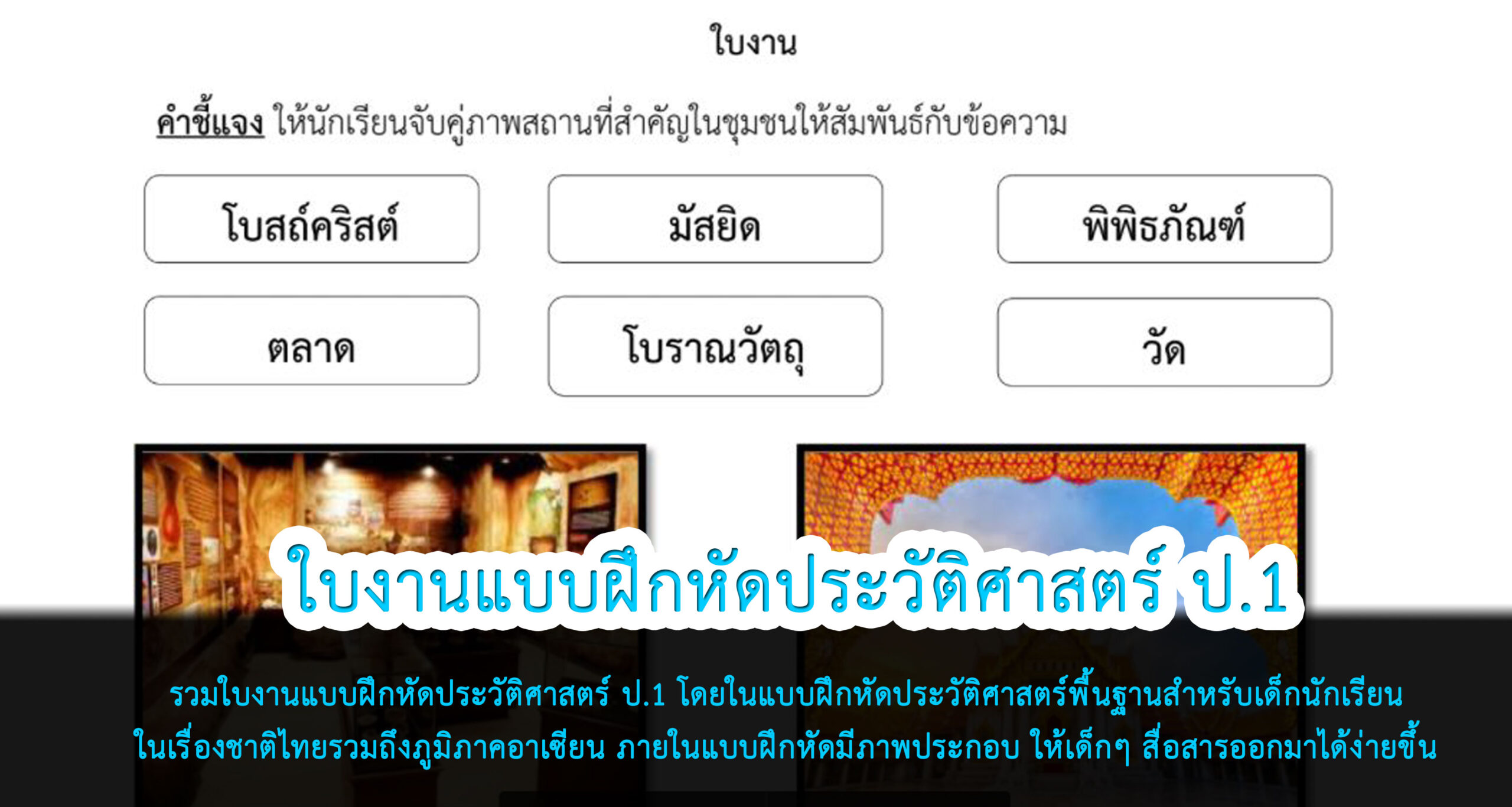 รวมใบงานแบบฝึกหัดประวัติศาสตร์ ป.1 โดยในแบบฝึกหัดประวัติศาสตร์พื้นฐานสำหรับเด็กนักเรียน ในเรื่องชาติไทยรวมถึงภูมิภาคอาเซียน ภายในแบบฝึกหัดมีภาพประกอบ ให้เด็กๆ สื่อสารออกมาได้ง่ายขึ้น ช่วยเสริมสร้างให้เด็กๆ มีความคิดสร้างสรรค์และความสนุกในการทำแบบฝึกหัดเพิ่มขึ้น