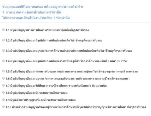 ในคุณสมบัติในการขอต่ออายุใบอนุญาตประกอบวิชาชีพ ให้คลิก หน้าหมายเลขของคุณสมบัติที่ท่านจะใช้ขอต่อ อายุใบอนุญาตประกอบวิชาชีพและกรอกรายละเอียดให้ครบถ้วน (กรอกรายละเอียดให้ครบถ้วนเพียง 1 ข้อเท่านั้น)