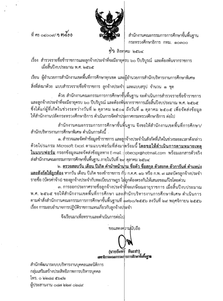 เรื่อง สำรวจรายชื่อข้าราชการและลูกจ้างประจำที่จะมีอายุครบ ๖0 บีบริบูรณ์ และต้องพ้นจากราชการ