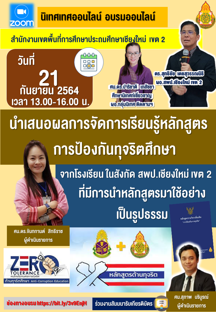 วันนี้ ใบงาน.คอม ข่าวการศึกษา ขอเชิญผู้ที่สนใจร่วมลงทะเบียนและรับเกียรติบัตรจากกิจกรรม นำเสนอการจัดการหลักสูตรป้องกันทุจริตศึกษา ซึ่งจะจัดขึ้น วันที่ 21 กันยายน 2564 เวลา 13.00 – 16.00 น. จัดโดย สพป.เชียงใหม่ เขต 2 สามารถอ่านรายละเอียดเพิ่มเติมด้านล่างได้เลยนคะ