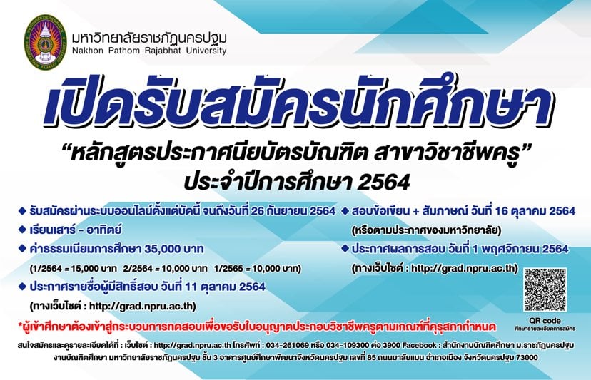 ดูรายละเอียดการสมัครเรียน ได้ที่เว็บไซต์ งานบัณฑิตศึกษา http://grad.npru.ac.th/