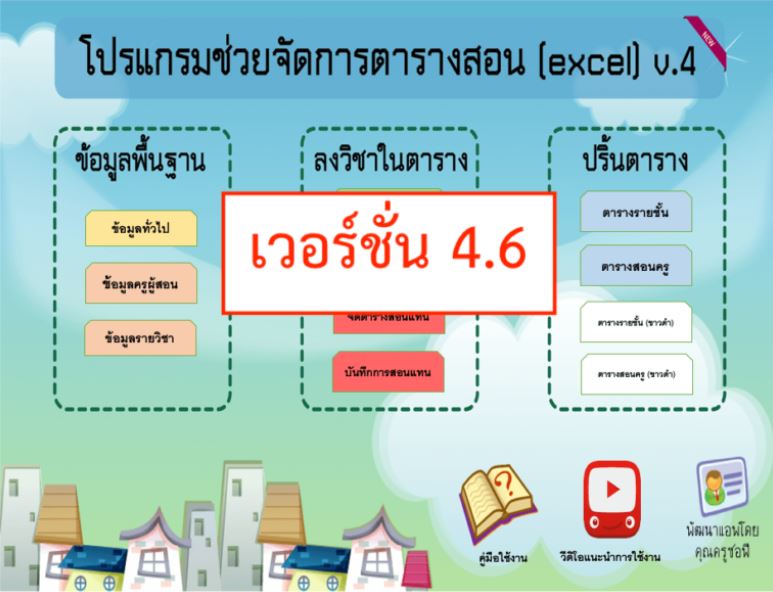 เป็นโปรแกรมช่วยจัดการตารางสอน ที่สร้างขึ้นจาก Excel ที่น่าสนใจมากครับ ตัวโปรแกรมมีรูปแบบน่าใช้ ผู้ที่ใช้งานครั้งแรกมีคู่มือให้อ่านแบบละเอียด คณะผู้จัดทำเองก็พัฒนาอยู่สม่ำเสมอ ล่าสุดอยู่ที่เวอร์ชั่น v4.6