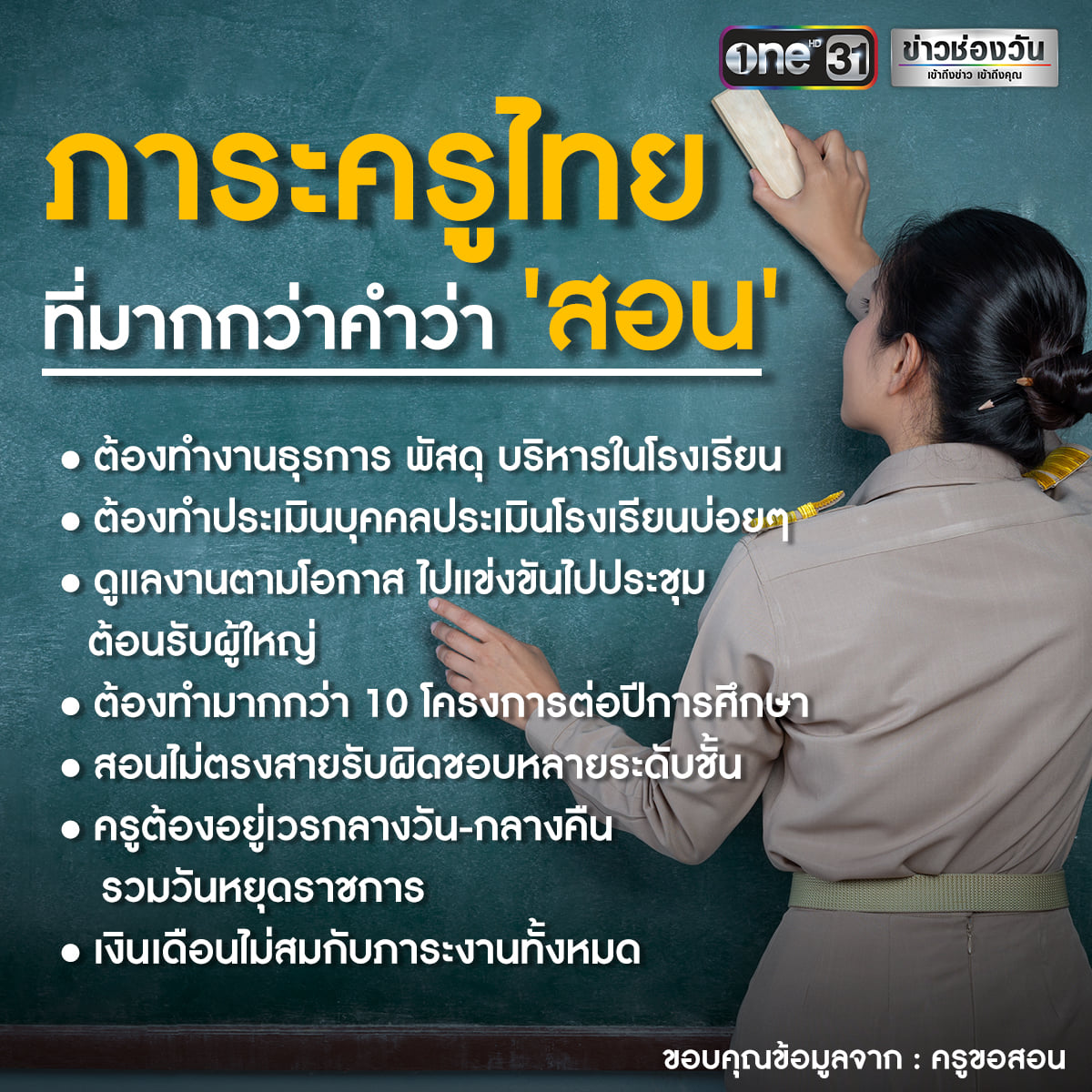 อาชีพครูคืออาชีพที่มีหน้าที่สอนนักเรียนให้มีความรู้ แต่สำหรับประเทศไทย ครูไม่ได้ทำหน้าที่สอนเพียงอย่างเดียว ยังมีภาระหน้าที่อื่นๆ ที่ต้องแบกรับ ซึ่งครูแต่ละโรงเรียนอาจจะแบกรับภาระงานที่นอกจากการสอนไม่เท่ากัน แต่โรงเรียนขนาดเล็ก ครู 1 คนอาจจะได้รับหลายหน้าที่มากกว่า อาจด้วยปัจจัยคนไม่พอ หรือไม่มีเงินพอในการจ้างบุคลากรเพิ่มเติม ซึ่งงานบริหารต่างๆ ในโรงเรียน ส่วนใหญ่ก็จะเป็นครูรับผิดชอบเกือบทั้งหมด ยกตัวอย่างเช่น