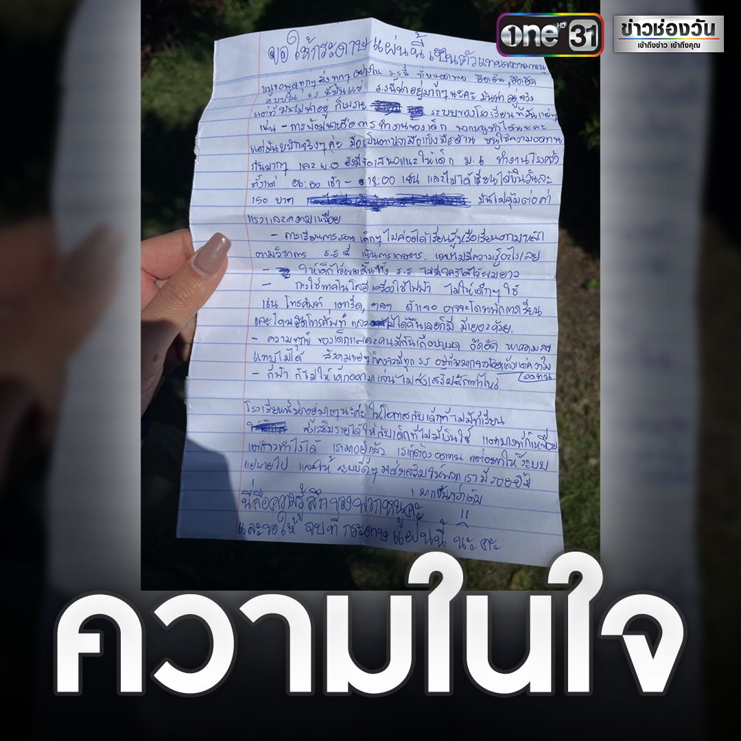 เด็กนักเรียนในโรงเรียนประจำ ที่ลพบุรี ที่มีข่าว 2 เด็กชายหนีไป 3 วัน 3 คืน มอบจดหมายฉบับนี้ให้กับผู้สื่อข่าว เผย รู้สึกอัดอั้นกับระบบโรงเรียน ถูกบังคับทำงานตั้งแต่เช้ายันเย็น ทุกข์ใจ-หาความสุขไม่ได้ ครูไม่ส่งเสริมระบบศึกษา และขอให้กระดาษแผ่นนี้เป็นตัวแทนความรู้สึกของนักเรียนภายในโรงเรียน