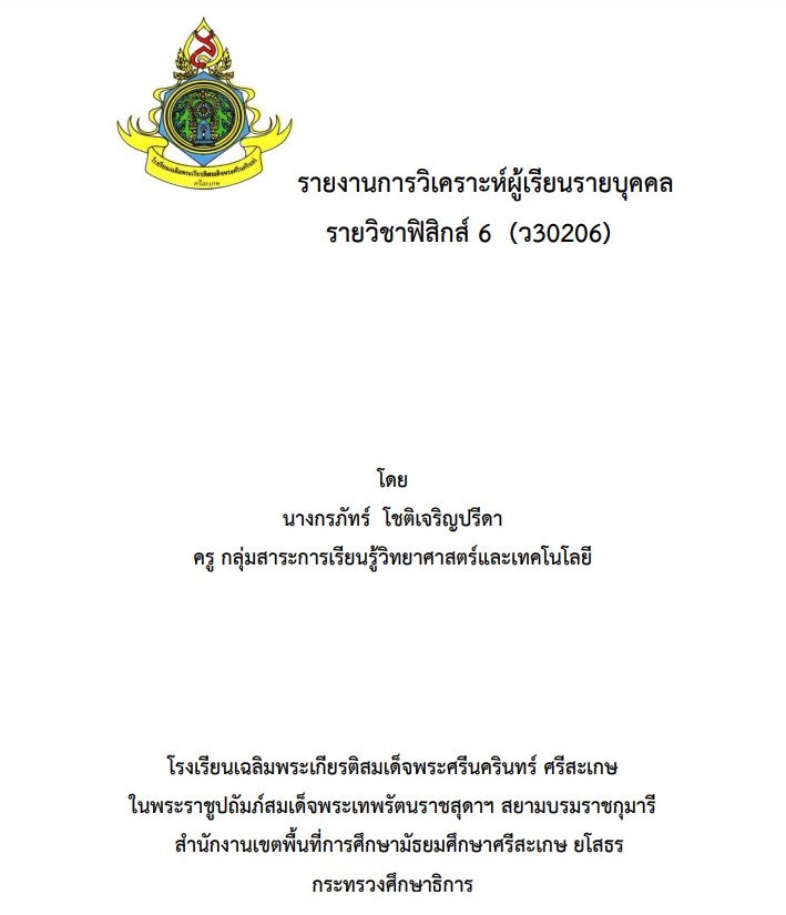 รายงานการวิเคราะห์ผู้เรียนรายบุคคล รายวิชาฟิสิกส์ 6 โดยคุณครูกรภัทร์ โชติเจริญปรีดา