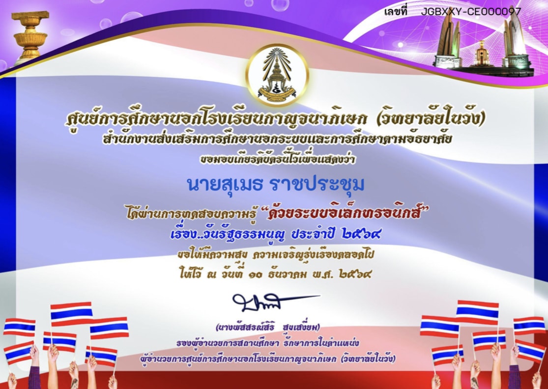 แบบทดสอบออนไลน์ เรื่อง วันรัฐธรรมนูญ ผ่านเกณฑ์ 70% รับเกียรติบัตรทางอีเมล โดย ศูนย์การศึกษานอกโรงเรียนกาญจนาภิเษก (วิทยาลัยในวัง)