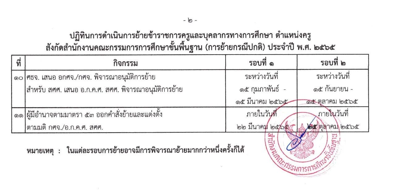 การย้ายข้าราชการครูและบุคลากรทางการศึกษา ตำแหน่ง ครูผู้สอน ปี พ.ศ.2565 โดยใน ปี 2565 ได้กำหนดปฏิทินให้ คุณครูยื่นคำร้องขอย้าย วันที่ 7-27 มกราคม 2565 แล้วประกาศผลย้ายครู 2565 รอบที่ 1 วันที่ 22 มีนาคม 2565 และประกาศผลย้ายครู 2565 รอบที่ 2 วันที่ 25 ตุลาคม 2565