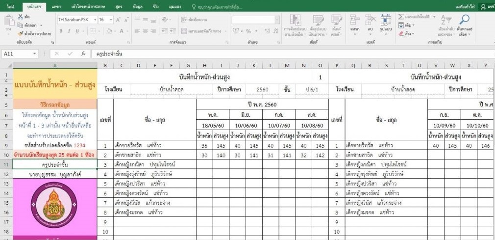 ไฟล์แบบบันทึก น้ำหนัก-ส่วนสูง นักเรียน สำหรับครูอนามัย และครูประจำชั้น N-project : โปรแกรม ปพ.5 ปพ.6