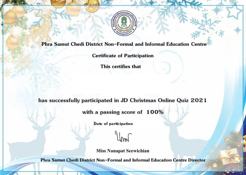 JD Christmas แบบทดสอบออนไลน์ 2021 โดย ห้องสมุดประชาชนอําเภอพระสมุทรเจดีย์ ตั้งแต่วันที่ 20 – 31 ธันวาคม 2021 ถ้าผู้เข้าร่วมทำแบบทดสอบ ตอบถูกมากกว่า 50% จะได้รับเกียรติบัตรผ่านทาง email