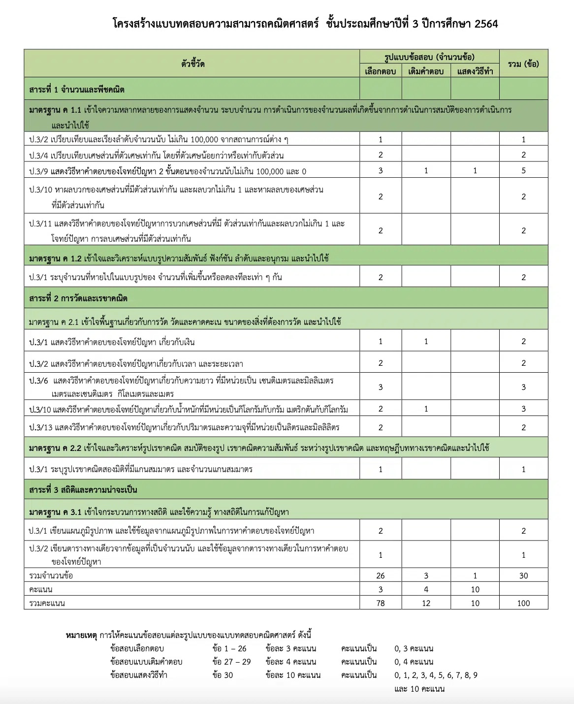 มาตรฐาน/ตัวชี้วัด โครงสร้างข้อสอบ NT ความสามารถด้านคณิตศาสตร์ ชั้น ป.3 ปี 2564