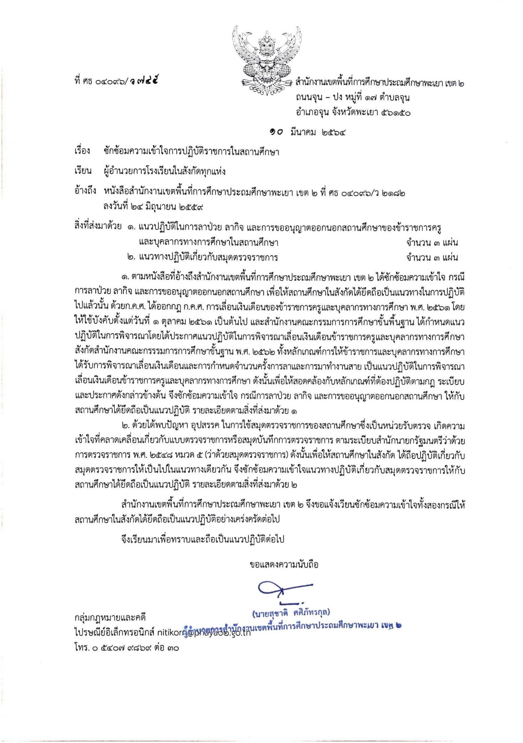 สำนักงานเขตพื้นที่การศึกษาประถมศึกษาพะเยา เขต 2 จึงขอแจ้งเวียนซักซ้อมความเข้าใจทั้งสองกรณีให้สถานศึกษาในสังกัดได้ยึดถือเป็นแนวปฏิบัติอย่างเคร่งครัดต่อไป